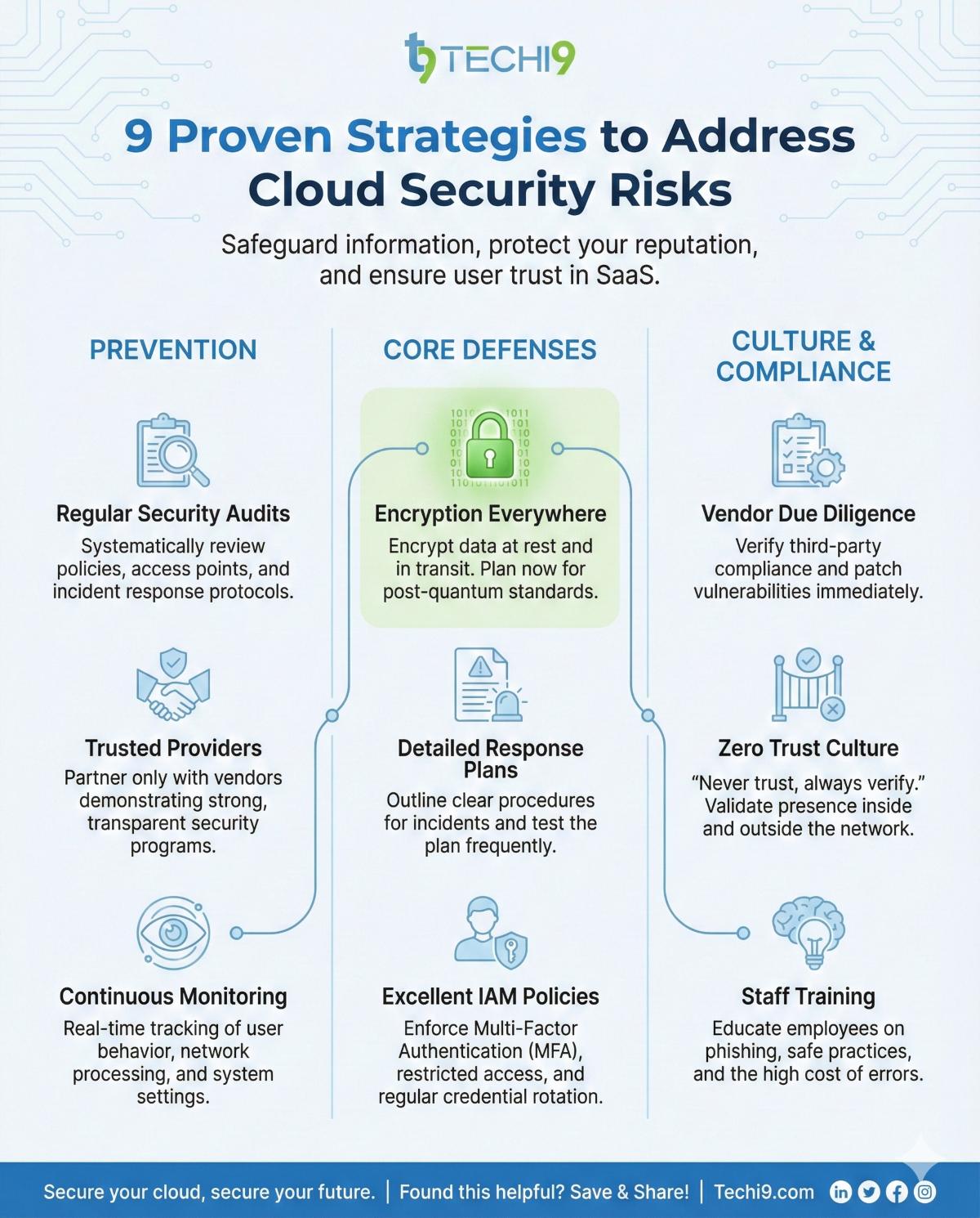 We will continue by talking about viable methods of alleviating cloud security risks in SaaS. The strategies help in safeguarding the information, reputation, and ensuring that the users are ultimately satisfied.
